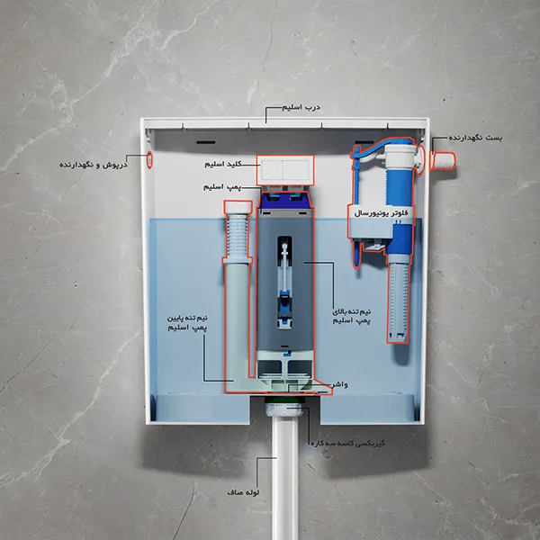 - ویژگیها: دارای دو دکمه با حجم آب متفاوت (کم و زیاد)