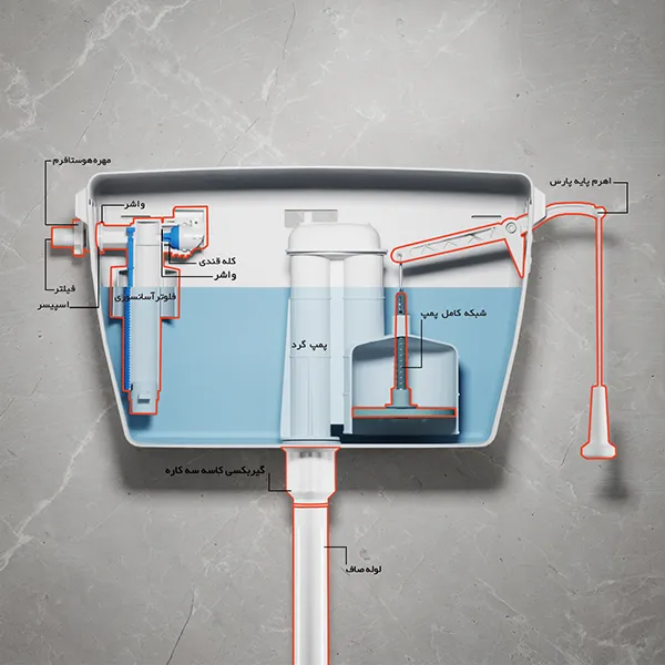 - ویژگیها: دارای دو دکمه با حجم آب متفاوت (کم و زیاد)